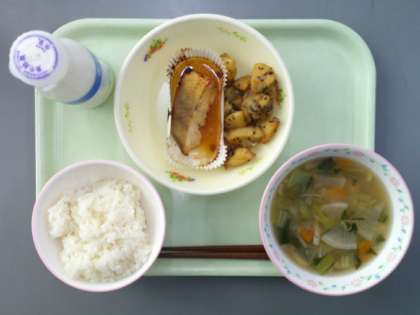 新出漢字の学習では、漢字の読みを音読して確認し、筆順(書き順)に沿って指で何度も書きます。それからドリルに鉛筆で書き込んでいきます。こどもたちも流れを理解しているようで、一生懸命取り組んでいました。 教科書の学習内容は、「はんたいのいみのことば」です。 「大きい」に対して「小さい」のように、反対の意味の言葉を探して、紹介し合いました。 個別学習ではなく、友達と共有することで、語いを増やすことにつながります。 個別と集団での学習のよさを生かして授業を展開しています。 11/11 揚げパン