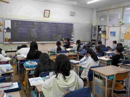 「ソイ丼」の「ソイ」は英語です。日本語にすると「大豆」です。甘辛味のあんにたくさんの大豆が入った栄養満点のメニューでした。おいしく食べ進めていくと、ごはんだけが残ってしまったり、反対にあんだけが残ってしまったりした子もいました。 バランスよく食べるのは難しかったようですが、おかわりをするなどして、よく食べていました。 11/18 5年生 算数2