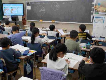 共通の問題を様々な視点で考え、学習のまとめをしたあとは、類似問題を解くことで、この時間に学んだ学習の定着を図ります。スキル(問題集)に熱心に取り組んでいました。 11/18 5年生 算数1