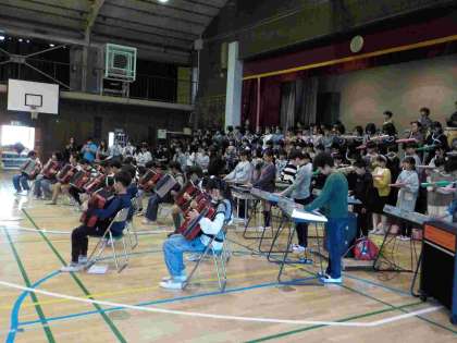 給食にピザ(トースト)が出るのは珍しいことです。こどもたちも楽しみにしていたようです。 トーストはピザ生地よりも厚みがあり、ボリューム満点でした。口の周りをピザソースで赤くしながら、1年生から6年生までおいしく食べていました。 11/20 6年生 音楽