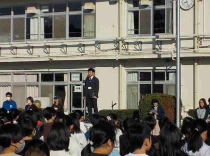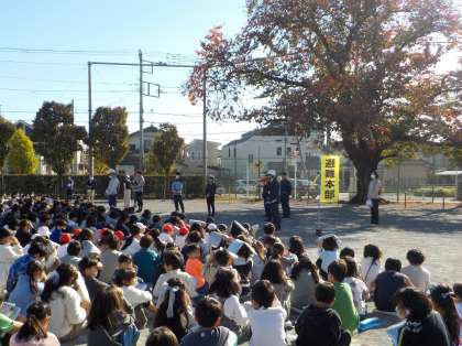 そうです。「地震」のあと「火事」になった場合の避難訓練でした。さらに今日は、避難訓練がいつあるか事前に伝えないで行う避難訓練でした。毎月1回、避難訓練がありますが、火事の場合や地震の場合、地震から火事になった場合など、様々なことを経験できるように計画しています。皆さんは、放送をよく聞いて避難することができましたか? 「地震」や「火事」などの災害は、いつ起こるか分かりません。先生が近くにいないかもしれません。ですから、話をよく聞いて、自分で考えて、正しく行動することがとても大切です。訓練を続ける中で、自分で判断できるようになってください。 今日は、このあと、2年生が煙ハウス体験をします。火災は、煙を吸い込まずに避難することがとても大切です。消防署の方の話をよく聞いて、命を守る学習をしてください。 これで校長先生のお話を終わります。 11/5 「小・中連携の日」会場校校長挨拶