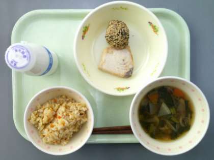 今日の給食のデザートは小豆(あずき)のごま団子でした。白玉粉に小豆をまぜて作った生地にごまをまぶして揚げました。すっきりした甘さで、こどもたちは喜んで食べていました。 12/1 1年生 特別活動