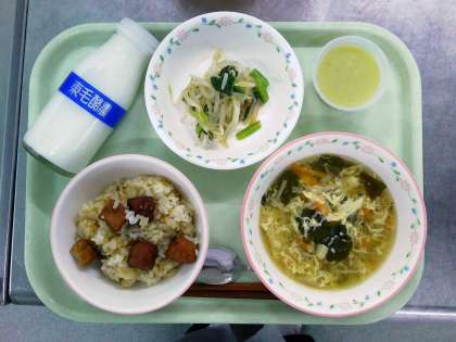 登場人物に合わせて声色やトーンを変えて読んでくださるので、こどもたちはお話の世界に引き込まれていました。ちょうどこの日の昼休みは1年生が校庭で遊べる日なので、「ともだちや」を聞き終えると校庭に飛び出していく子もたくさんいましたが、少ない人数になっても読み聞かせを続けてくださいました。いつも臨機応変に対応してくださるボランティアの方々に感謝です。 10/17 戻り鰹の炊き込みごはん