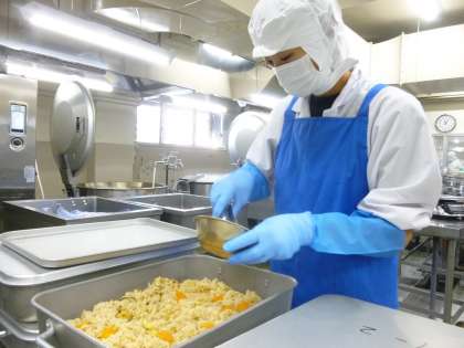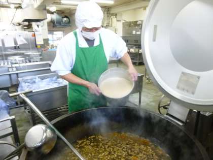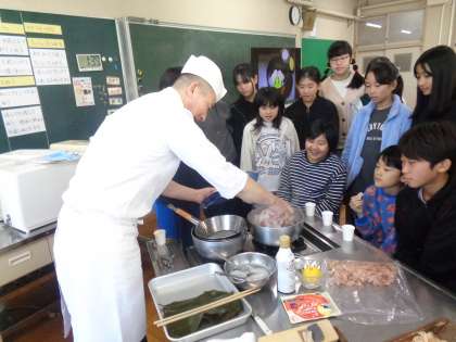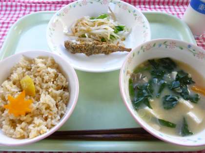 おととい、11月2日は「十三夜」です。 10月の十五夜に引き続き、きれいなお月様を眺める日です。 十三夜は「栗名月」「豆名月」ともいわれ、栗や豆をお供えしたり、食べたりします。 給食でも行事食として、「栗のたきこみごはん」と、大豆を使った「呉汁」を作りました。 真ん中の写真は、もみじ型にした人参を栗ごはんに飾っているところです。 一番下の写真は、「呉(大豆をすりつぶしたもの)」を汁に加えているところです。 「くりごはんがおいしかったです。」 「ししゃものかわりあげがおいしかったです。」 「ししゃもがさくさくでおいしかった。」 「ごじるがおいしかったです。またつくってください。」 などの感想が書かれていました。  |