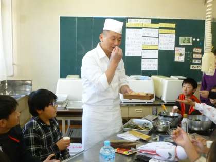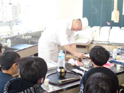 ゲストティーチャーをお招きして、和食やだしについてお話を伺いました。 和食にはいろいろな料理があることや、日本に昔から伝わる調味料や旬の食材などについて学習しました。 後半は、だしのひき方についてデモンストレーションをしていただきました。 昆布とかつお節でだしをひく様子を見て、こどもたちは目が釘付けでした。 かつお節を加える場面では「うわぁ!そんなに入れるの!!」と驚いていました。 かつおを削るのを実演していただき、ひき立てのかつお節を味見したり、水出しの昆布だし、昆布とかつお節のだしの試飲もしたりして、「おいしーい!」「家でもやりたい!」と興味津々でした。 家庭科室には、だしの良い香りがただよい、ほっこりした時間を過ごしました。 「いくら飲んでも飽きない」という講師の先生の言葉通り、ひきたてのだしの味は格別でした。 和食について知り、体験する、貴重な機会となりました。 11月4日(火)の給食