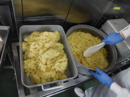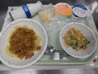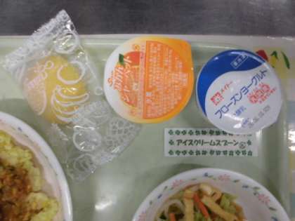 米 75g カレー粉 0.3g サラダ油 1.5g にんにく 0.3g 生姜 0.3g 豚ひき肉 20g 大豆 10g たまねぎ 70g にんじん 20g ピーマン 5g ホールトマト缶 20g レーズン 2g 白ワイン 1g カレー粉 0.5g 塩 0.5g こしょう 少々 ガラムマサラ 0.1g しょうゆ 3g ウスターソース 3g トマトケチャップ 5g 作り方 1 米はカレー粉を入れて炊く。 大豆は水につけておき、やわらかくなるまで茹でる。 (水煮大豆を使っても良いです。) 2 野菜と茹でた大豆はみじん切りにする。 3 サラダ油を熱してにんにく・生姜を炒め、たまねぎを加えてよく炒める。 4 豚ひき肉を加えて炒める。 5 にんじん・ピーマンを加え、カレー粉を振り入れてじっくり炒める。 6 ホールトマトをつぶして入れ、大豆・レーズン・調味料を加えて弱火で煮込む。 7 炊きあがったごはんに6をかけて食べる。 ![]() ![]() ![]() ![]() 7/17(木)の給食![]() ![]() ![]() ![]() ![]() ![]() クイズの答えです。1の大豆です。枝豆は大きくなると大豆になります。大豆からは豆腐や油揚げが作られます。 今日で一学期の給食が終わります。残さず食べることはできましたか?片づけはきれいにできましたか?一学期の給食を振り返ってみましょう。リザーブデザートは給食委員会が決めたものです。自分がどれを選んだか覚えていましたか? 一学期最後の給食は残さず食べるクラスが多くてとてもうれしかったです。すてきな感想を届けてくれるクラスもありました。二学期の給食は9月1日から始まります。 クイズです。選んだ人が一番多いのはどれでしょう。 1みかんシャーベット 2冷凍りんご 3フローズンヨーグルト 7/16(水)の給食![]() ![]() ![]() ![]() ![]() ![]() クイズの答えです。2の4種類です。ジュリアンスープに入っている小平産は、にんにく・たまねぎ・にんじん・じゃがいもの4種類でした。夏野菜のミートグラタンを入れると8種類の小平産を使っていました。 今日の副菜、野菜のおかずは小平産のゆで枝豆です。3年生が育てた枝豆が入っています。3年生がさやもぎしてくれました。3年生に感謝して味わって食べてください。 クイズです。枝豆は大きくなると何になるでしょう。 1大豆 2そら豆 3グリンピース うさぎのメロンちゃんお空へ