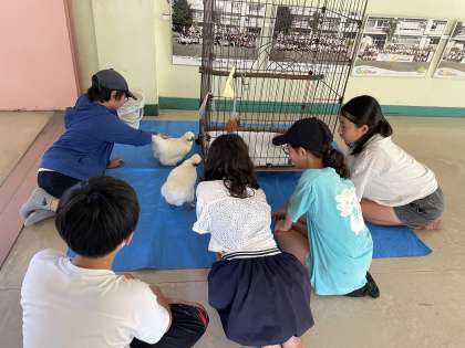 夏休みに入り猛暑日が続いています。お世話に来た生きもの委員会の児童に校舎内で遊んでもらっています。