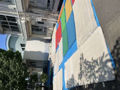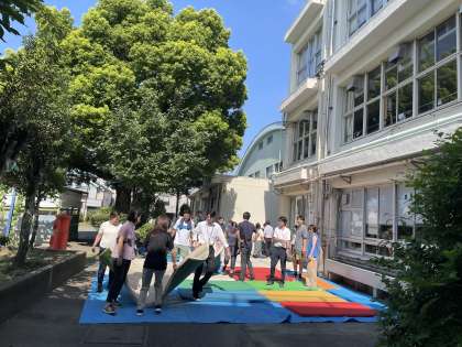 体育館のマットを外に並べて天日干ししてます。職員総出で作業しました。