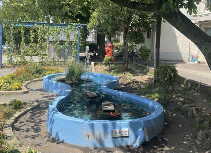 夏休み中でも、カメのひょったんは元気に過ごしています。ひょうたん池の水もいつも通りに取り替えています。烏骨鶏のこむぎとみるくは校内にて避暑しています。