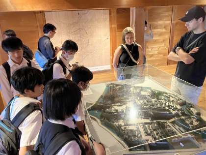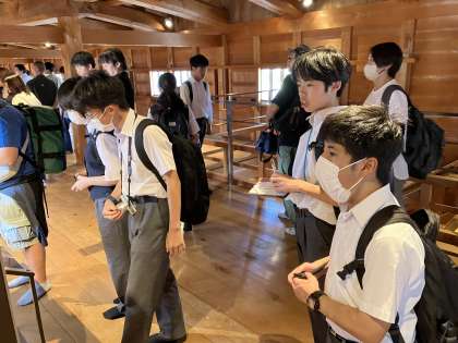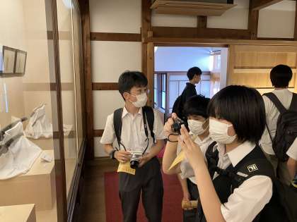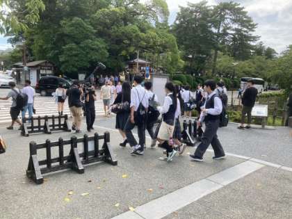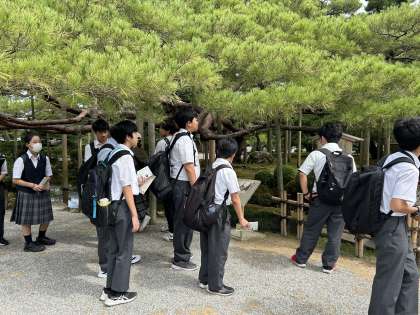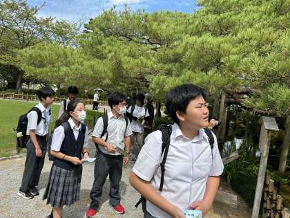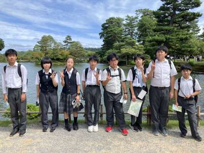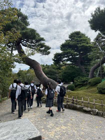 修学旅行2日目、KAM九谷焼美術館を見学した後は、兼六園に向かいました。金沢商業高校の高校生のガイドを受け、班ごとに見学を行いました。