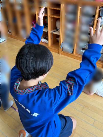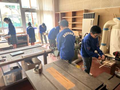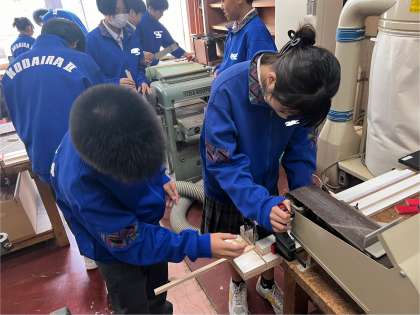 技術の時間にタブレットスタンドを作っています。今日は、初めてノコギリを使って木材を切りました。各班のリーダーが先生の説明を受け、その内容を班の仲間に伝えながら作業を進めました。友達に分かりやすく教える中で、相手の立場に立って説明する力や、仲間と協力して課題を解決する力が育まれています。