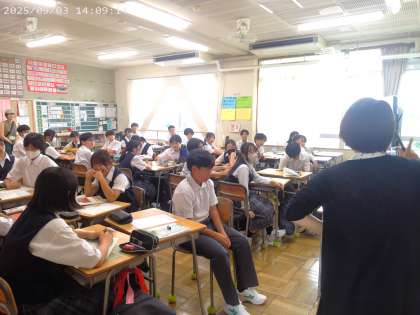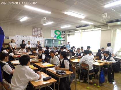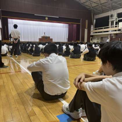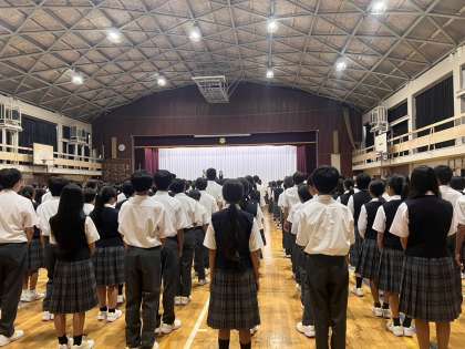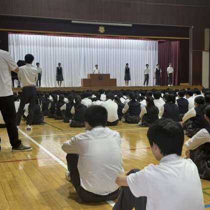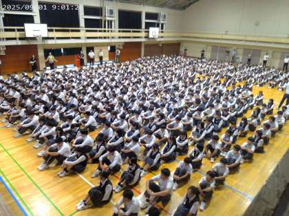 9月1日(月)2学期始業式を実施しました。酷暑の中、エアコンの効いた体育館で久しぶりに全校生徒が集まりました。校長先生より夏休みの振り返りの後、終戦80年に当たり本校近郊の戦争時の様子が伝えられました。また、今学期も様々なことに挑戦していくよう、エールが送られました。その後、生活指導担当より、つらいことがあれば近くの大人に相談するよう話がありました。最後に、都大会等に出場した7つの部活動より結果の報告があり、全校で健闘を称えました。