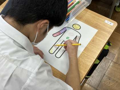 G組は、個性や自分の内面のよい部分について考えました。体のイラストによいところを記入し、色で表現しました。