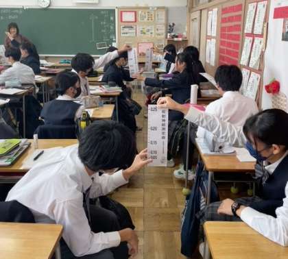 10月28日(火)2年生理科の授業は「神経の働き」について学習しています。反射測定装置を使った実験で反射神経を確認し、集団が輪になって手を握る時間を測定する実験では、感覚器官から運動器官に伝わる時間を計りました。
