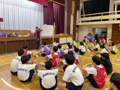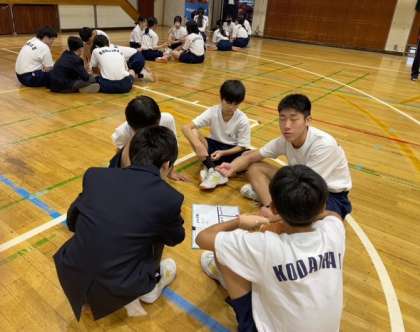 10月28日(火)1年生の体育のめあては「オフ・ザ・ボールを意識した5対5の攻防を実践する」です。バスケットボールを行う前に、各チームで独自の作戦や、味方にかける「プラスワード」「Goodワード」を考え、試合で実践しました。