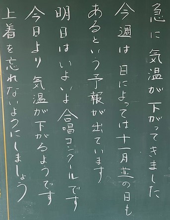 体育館で行える最後の合唱練習でした。声が大きくなってきて体育館に響くほどでした。火曜日の本番が楽しみです。