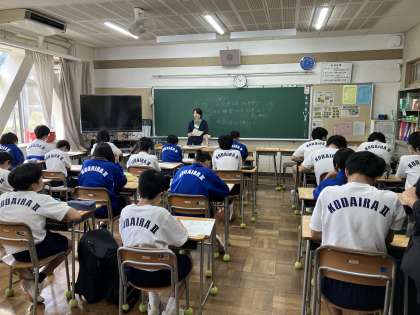 10月14日(火)1年生の数学は「方程式を使って説明しよう」のめあてで進みました。500円玉と100円玉が大量に入った袋が示され、それぞれ何枚あるか方程式を使って枚数を求めました。他校から多くの先生方が参観する中、生徒は普段通りの雰囲気でメリハリをつけて学習していました。
