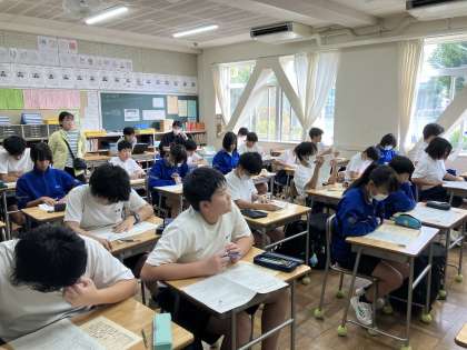英語の授業でALTの先生に来ていただいて授業をしました。英作文の作り方をアドバイスしていただいたり、アルファベットカルタやペアワークをしました。