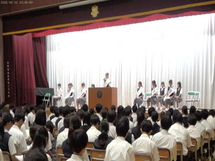 9月12日(金)午後、体育館で令和7年度生徒会役員選挙立会演説会を実施しました。選挙管理委員会が運営し、演説終了後は教室で投票を行いました。本部役員の立候補者は7名で、それぞれどのような学校にしていきたいか、直接全校生徒に演説し、応援演説者がサポートしました。専門委員長は定数7名のところ16名立候補が出る激戦の中、各候補者は抱負を述べ、良さを伝えました。結果は16日(火)に校内に掲示されます。