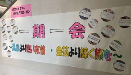 校内には3年生が作成した修学旅行スローガンが飾られています。「一期一会 〜温泉より熱い友情 金箔より輝く旅を〜」 とても素敵なスローガンです。熱い友情をたくさん感じ、輝く旅にしていきましょう。