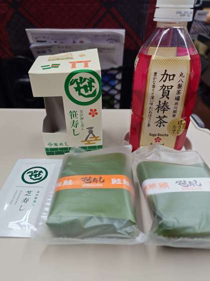 石川では昔からお祝いごとや祭りなどのハレの日に家庭で押し寿しをつくる風習がありました。その伝統から生まれた金沢のソウルフードである芝寿しの笹寿しをたべました。そして加賀棒茶です。