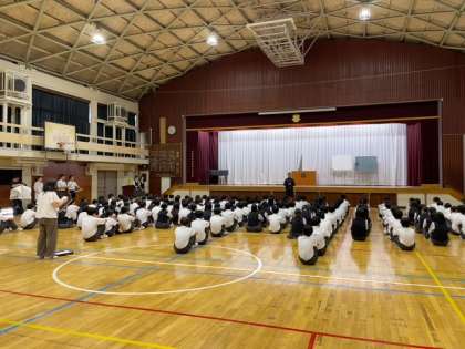 9月22日(月)朝、体育館で2年生が学年集会を実施しました。先週3日間の職場体験について、主任より頑張った労いと振り返りが伝えられました。その後、担当より事後学習について説明しました。
