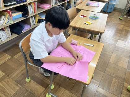 家庭科の授業で刺しゅうをしています。1.2年生は自分の好きな柄を選び、3年生は金沢の柄を選んでいます。みんな集中して取り組みました。