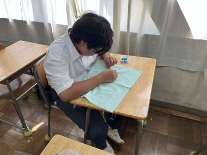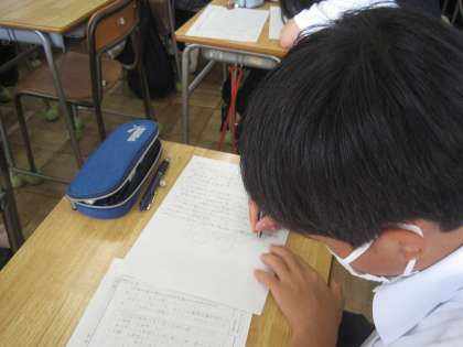 先週の職場体験を終えて、お世話になった事業所の方々にお礼状を書きました。国語の時間に学習した手紙の書き方を活かし、言葉遣いや文字に気をつけて丁寧に書きます。