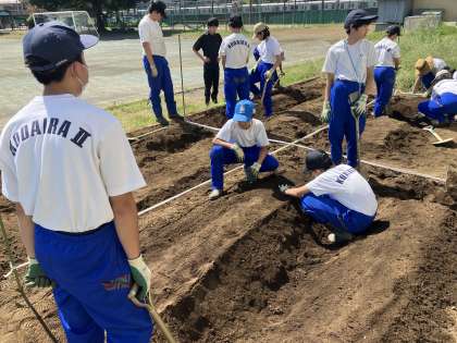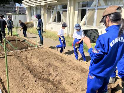 グループで今日の活動について話し合いをして、その後畝作りをしました。