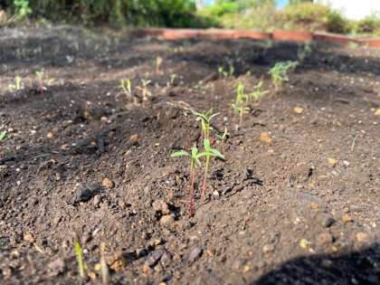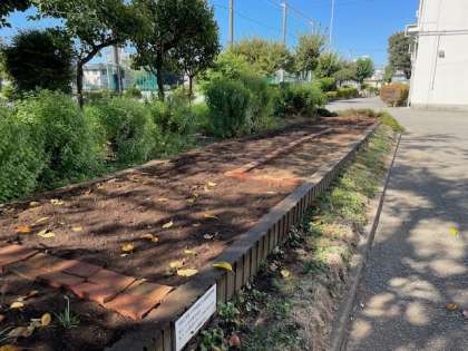 9月26日(金)正門横の花壇に秋桜の小さな芽が出ました。22日(月)に整備して種をまいたものです。今後どのような秋桜花壇になるのか、楽しみです。煉瓦で区切ったスペースには、11月を目途に校章のスミレを植える予定です。