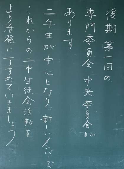 後期の委員会と係を決めました。どのクラスも学級委員が司会をして順調に決まっていきます。先日の生徒会選挙でも多くの立候補がでましたが、クラスでも委員会に参加する生徒が多く、活気を感じます。委員会と係の活動が学校生活を支えています。後期も元気に頑張りましょう。