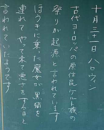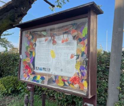 本校正門横に大きな掲示版があり、毎月の学校だよりを載せています。掲示は季節ごとに手作りの装飾で飾られ、道行く人を楽しませています。SSSの尽力で、毎月新しく素敵な装飾に切り替えられています。今月は落ち葉がいっぱい敷き詰められ、栗の音符がアクセントになっています。