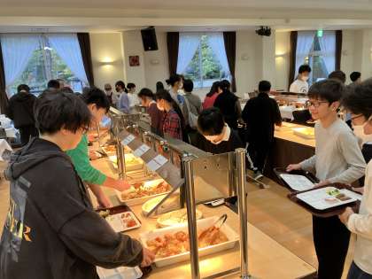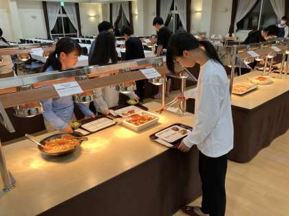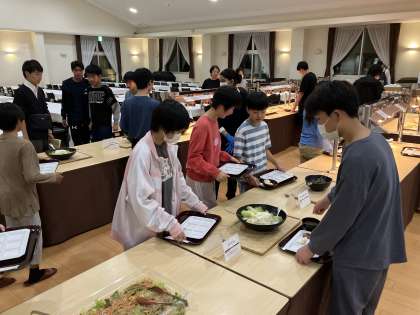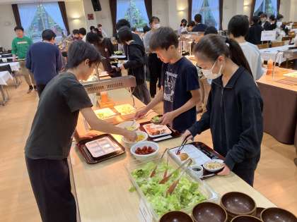 今日の夕食はブュッフェ形式でした。みんな好きなメニューを選んで食べました。