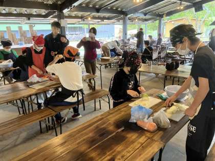 キャンプ場で飯盒炊爨(カレーライス作り)をしました。はじめに3グループ(ご飯、野菜、火をつける)に分かれて作業をしました。