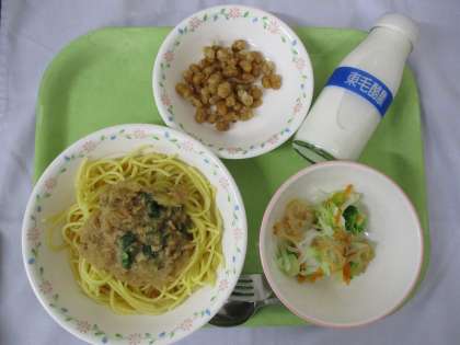 ・牛乳 ・ツナおろしスパゲティー ・秋野菜フレンチサラダ ・メープル豆 今日は小平産の大根をたっぷり使ってスパゲティーのソースを作りました。ツナを入れて醤油で味付けをした和風パスタです。すりおろした大根は、汁もまるごと使用しました。大根の苦みが少し残っていましたが、子どもたちはよく食べてくれていました。