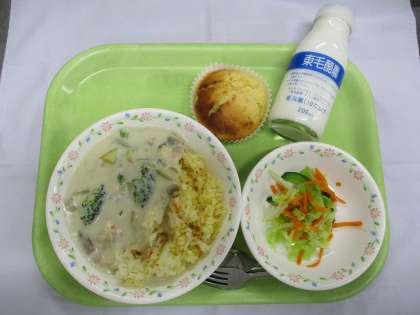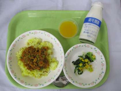 ・牛乳 ・ドライカレー ・ほうれん草のサラダ ・オレンジゼリー 今日は就学時前健診がある日だったので早出し給食の日でした。そのような日はみんなが食べやすいように献立を考えています。今日はドライカレーでした。アレルギーになる食材を使わず六小の児童みんなが食べられるドライカレーです。野菜の甘味の中に、ピリッとカレーの辛さを感じられるおいしいドライカレーになりました。ほぼ全クラス完食でした♪