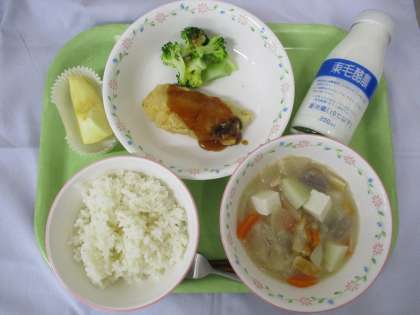 ・牛乳 ・ごはん ・ホキの竜田揚げ てりやきソース ・ブロッコリーのおかかあえ ・呉汁 ・くだもの(りんご) 11月24日は「いい(11)にほんしょく(24)の日」で「和食の日」に制定されています。今日は和食献立にしました。竜田揚げは醤油で味付けをした魚に、片栗粉をまぶして揚げた料理です。奈良県の竜田川に浮かぶもみじの葉に見た目が似ていることからそう名前が付けられたそうです。この時期にぴったりの料理です。給食も季節を感じながら食べてくれると嬉しいです。