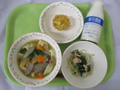 ・牛乳 ・ほうとう ・もやしとツナのうまあえ ・いがぐりあげ 今日は山梨県の郷土料理のほうとうを作りました。小麦で作った平たい麺をみそ仕立ての汁で煮込んで作ります。今日は冬野菜をたっぷり入れて煮込んで作りました。麺を入れて煮込むので汁にもとろみがついて、体も温まる一品です。いがぐりあげは、つぶしたサツマイモを丸めて、まわりにそうめんをつけて揚げて作ります。いがぐりのトゲトゲをイメージして作りました。