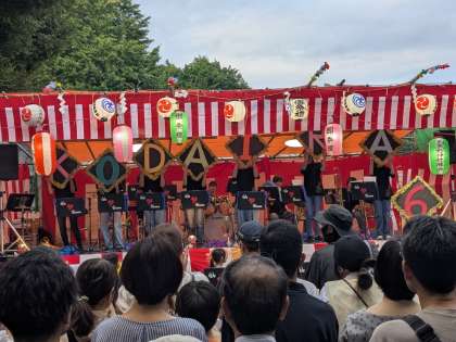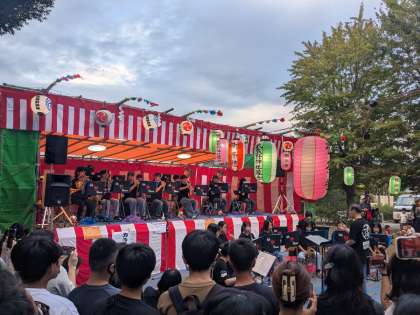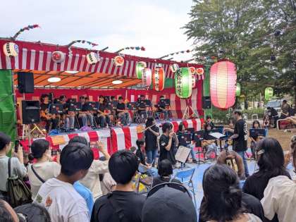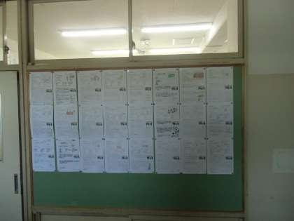 保護者の方に普段の授業を見ていただく良い機会です。 廊下にもいろいろな掲示物があります。 写真は2年生の職場体験レポートです。 下の写真はただ仲良く手をつないでいるわけではありません。 理科で、神経の働きを学んでいます。 武蔵野神社のお祭りにて
