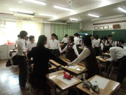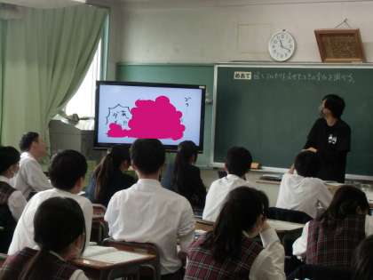 内容が難しかったり、得意、苦手だったり、気分が前向き、後ろ向きだったりと、人間ですから調子の波はどうしてもあります。 そんなときでも、全生徒が興味関心をもって授業に取り組めるように各教員が色々な工夫をしています。 ICT機器を利用して、理科の中和の説明をするために、キャラを利用して、こんな工夫もしています。 *ピンクのところには子供たちに人気のキャラクターがいます。 面接に向けて