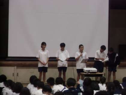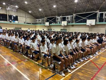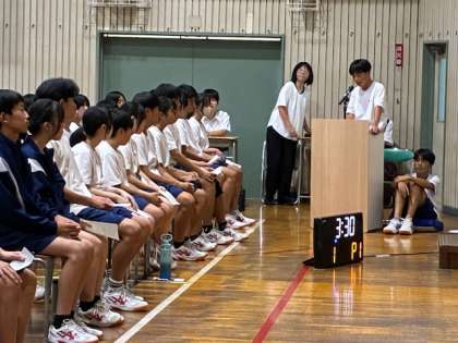 学習に集中して取り組んだ3年生が、 部活動の中心になって活動した2年生が、 中学生になって初めての夏休みを過ごした1年生が それぞれのペースで成長して学校へ、戻ってきました。 2学期は行事も多く、一番長い学期です。 良い準備をして、それぞれの勝負の場で活躍できるようにしてくださいね。 *熱中症の予防対策のため、体育館での集合は短くし、表彰、生活指導主任からの話はオンラインで実施しました。写真はオンラインを見る様子と、表彰される生徒が順番を待っている様子です。