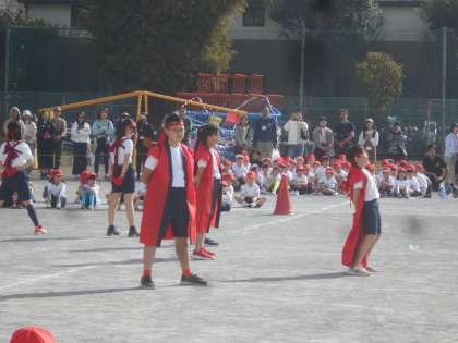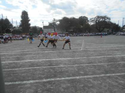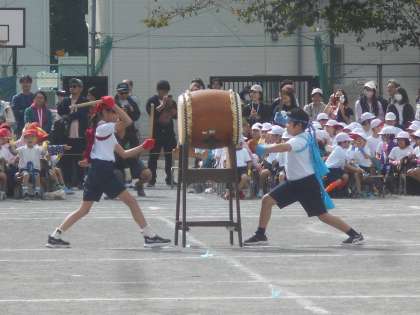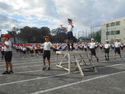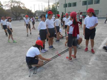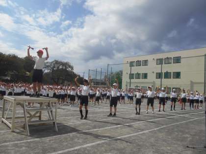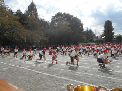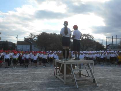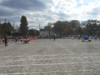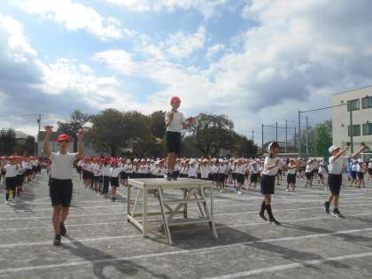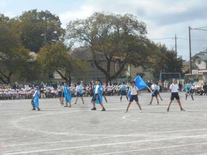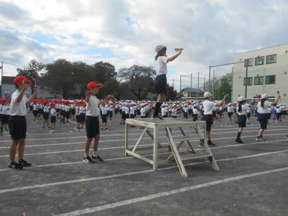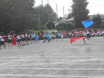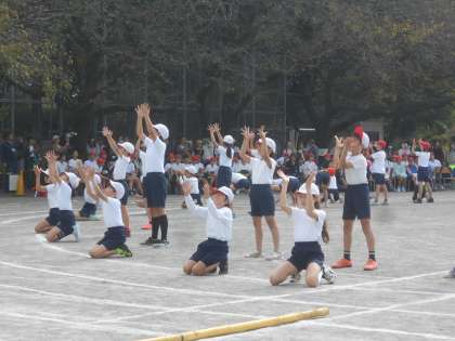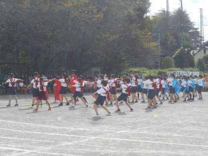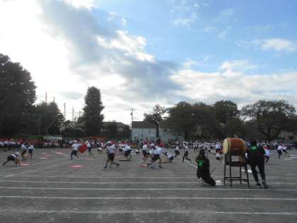 前半の部が終わり、こどもたちは給食をいただくためにいったん教室に戻ります。 校庭に出していたそれぞれの児童椅子もここで教室に片づけます。 当初の予定では、午前中で運動会は終了の予定でしたが、 雨天順延で、当日の朝に一から準備をし直さなければいけないところも多く、 その準備のために全校競技や応援合戦、閉会式は給食後に行うことにしました。 しっかり給食をいただいて、 今度は椅子なしでこどもたちは校庭に出てきました。 午後の部の始まりです! オープニングは、 全校応援合戦です。 この後に続く全校競技「心を一つに大玉送り」に向けて、 気合を高めていきます。 フレフレコールや三三七拍子など、 応援団を中心にみんなが一体となって盛り上げていきました。