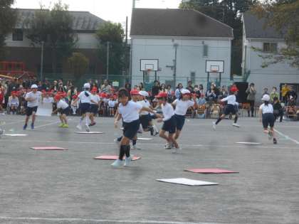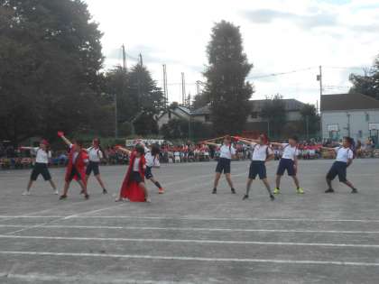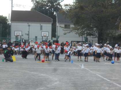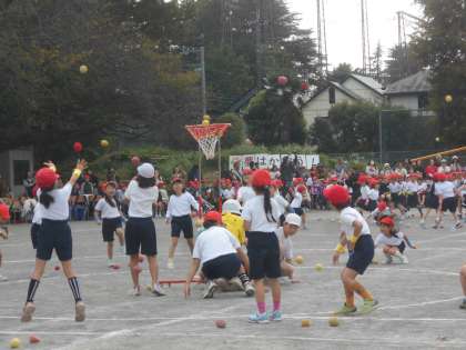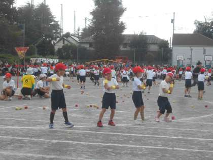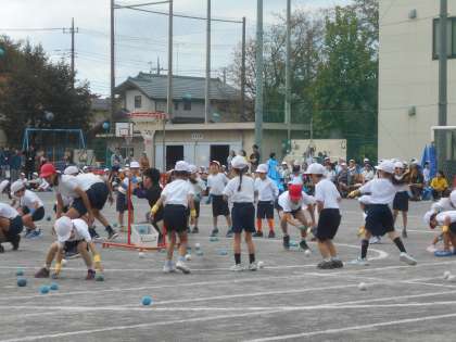 プログラム6番は、1年生の団体競技 「玉入れ!?ダンス!?みんな いいね!!」 です。 運動会での1年生の競技といえば、「玉入れ」ですね! でも、この玉入れはただの玉入れではありません。 曲に合わせて楽しくダンスを踊って、 そのダンスとダンスの間に玉入れをするのです。 全員が腕に色とりどりのリストバンドを付けて、 その姿が、とてもかっこよくて、可愛らしくてワクワクします。 踊って楽しく、戦って楽しい! 観ている方もやっている方も お互いが楽しめるとても素敵な工夫ですね! 最近のこどもは、投げる力が衰えてきているといわれますが、 1年生はかなりいい感じにカゴに玉を入れていました。 体を上手に使って、なかなかいい投げ方だな、 なんて感心しながら観戦しました。