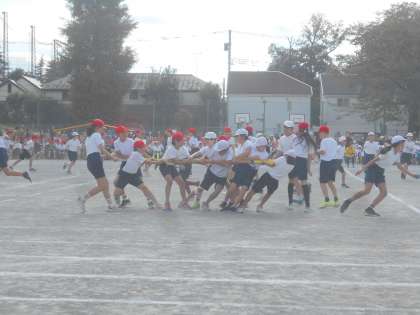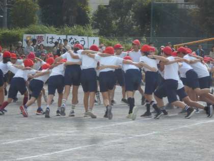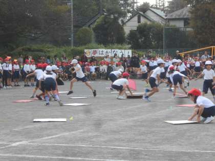 プログラム2番は、3年生の団体競技 「リバーシ合戦〜SHOGUM〜」 です。 この競技は、表と裏がそれぞれ赤と白に塗り分けられた段ボール板をひっくり返し合って、 制限時間の時に、板の色が多かった方が勝ちになります。 最後のぎりぎりまで、一生懸命相手の色の板をひっくり返し続けます。 見ているうちに、優勢な色がどんどん変化していって、 応援する方も思わず力が入ります。 どちらが勝ってもおかしくない、 手に汗握る熱戦でした!