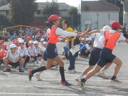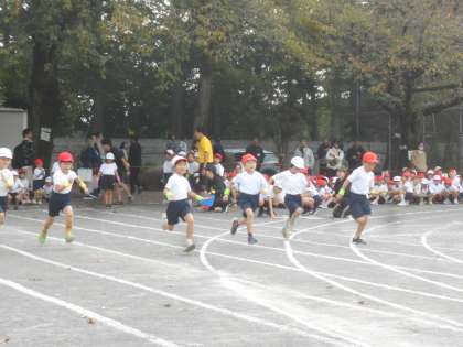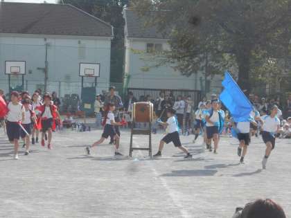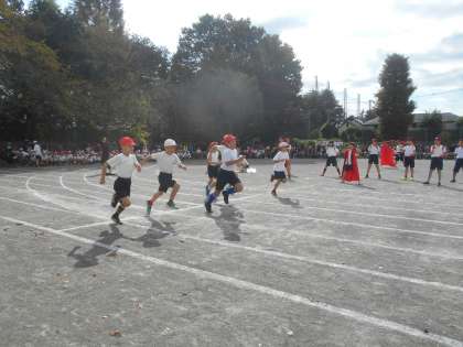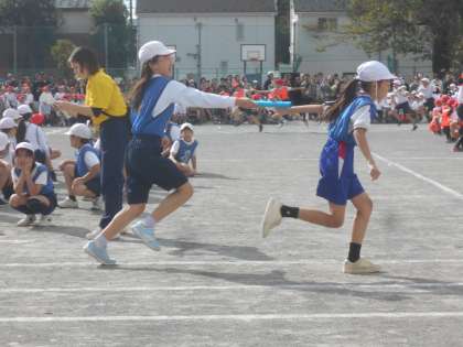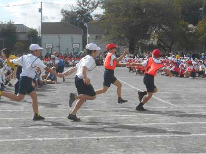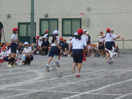 プログラム4番は、5年生の全員リレー 「Fantastic リレー」 です。 5年生は、1学期に体育で「リレー」の学習をしました。 ここは、その学習の成果を発揮する場でもあります。 リレーの見せ場は何といっても、バトンパスです。 トップスピードで走ってくる仲間のバトンを できる限りトップスピードで受け取る!! 限られたバトンゾーンをいかに有効に使うか、 仲間と呼吸をいかに合わせていくか、 1学期の学びをベースに、運動会直前まで技を磨いてきました。 走ってくる仲間を見ることなく、 お互いの呼吸でスタートし、 絶妙のタイミングでさっと手を出して確実にバトンを受け取る、 そんな見事なバトンリレーも随所に見られました。 お互いが技を磨き合ってつくりあげた姿に、 勝敗を超えて大きな拍手がおくられました。