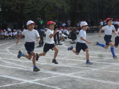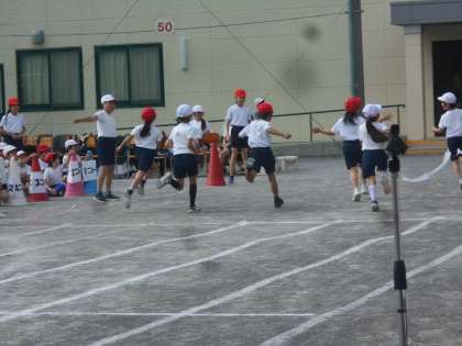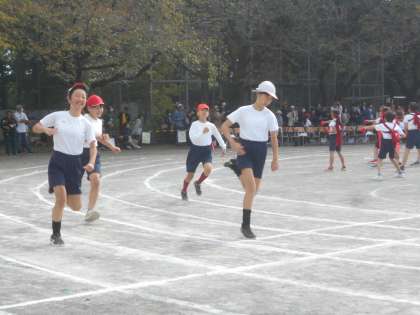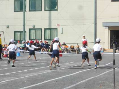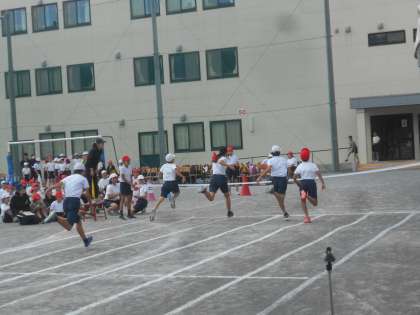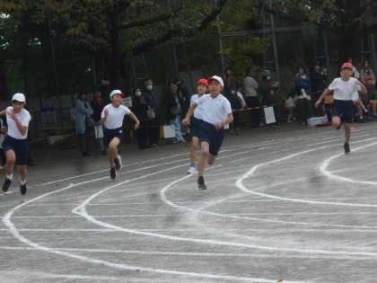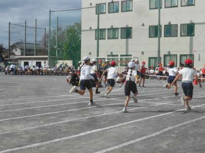 運動会後半の部の競技のスタートは、 4年生の短距離走 「限界突破!80m」 です。 短距離走としては、4年生から曲走路となり、 距離も一気に倍の80mになりました。 最後まで力を尽くして走り抜けることが目標です。 順位はもちろん気になるところでしょうが、 大切なのは、種目名にもある 「限界突破!」 つまり、自分自身への挑戦です。 より力強く! より速く!! 一人一人の力一杯の挑戦に、惜しみない声援がおくられました。