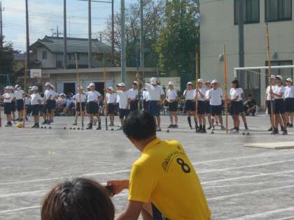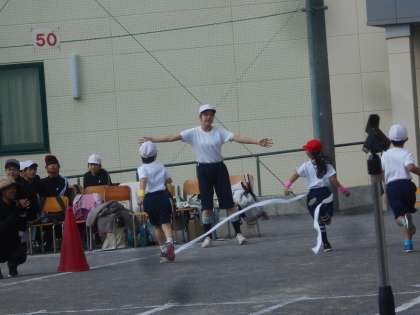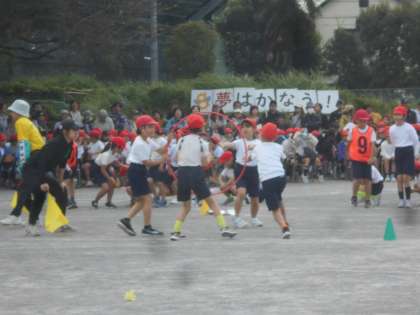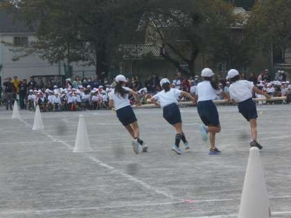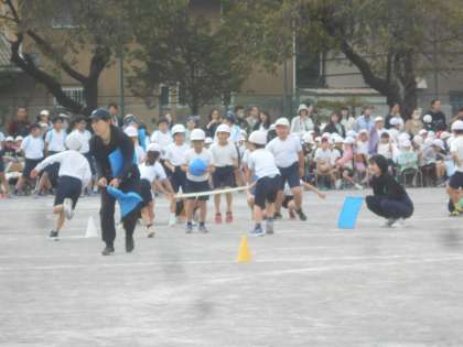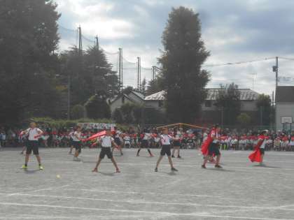 プログラム10番は、2年生の団体競技 「力をあわせて!リングボール」 です。 これは、二人でボールをパスしながら前に進んでいくというゲームです。 ただし、二人の間には、フラフープがあります。 フラフフープの中を通すようにボールをパスし、 パスされたさらに向こうに素早くフラフープを移動させます。 同時に、始めにパスをした人がフラフープのさらに向こうにまわってパスを受け取ってすすんでいきます。 ボールをパスする2人と、フラフープを持つ人とがしっかり呼吸を合わせることと 慌てず正確に相手に取りやすいパスを素早く出すことが勝利のポイントです。 分かってはいるものの、 ゲームが始まると、パスをする方も受け取る方も、 ドキドキしてしまって、思わず力が入りすぎてしまう・・・ そんなシーンが続出して、 観ている方もそれにつられてドキドキしてしまう・・・ そんな競技でした。 この競技は、大人がやってもかなり楽しそうです!