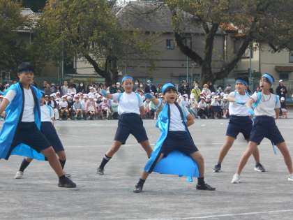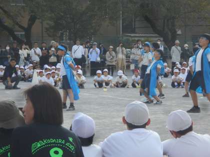 後半の部のスタートは、 偶数学年のこどもたちによる 「八小よさこい」 の演舞です。 鳴子の音がとても軽快です。 このよさこい踊りは、 1学期にASEANからの教育交流で来られた方々とも一緒に踊りました。 八小と八小卒業生にとってのふるさと文化でもあります。 みんなで踊るのは、年に1回のこの運動会のときくらいですが、 大事に踊り継いでしっかり伝えていきたいですね!