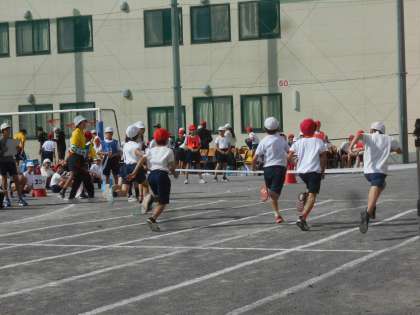 プログラム3番は、1年生の40m走 「よういどん!夢のスタートライン」 です。 小学校に入学して初めての運動会です。 40mの挑戦コースを 1年生は全力で走りました。 1年生とは思えない、 力強い全力走でした。 2年生以上の上学年のお兄さんお姉さんたちも 1年生の元気な走りに惜しみない声援を送っていました。