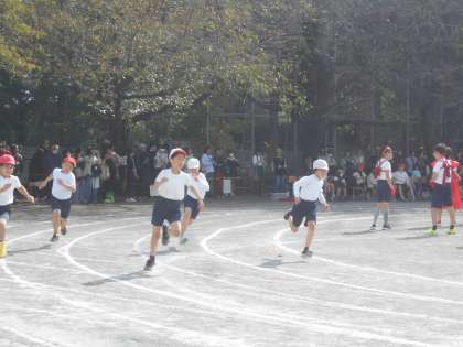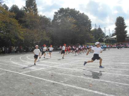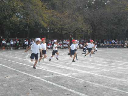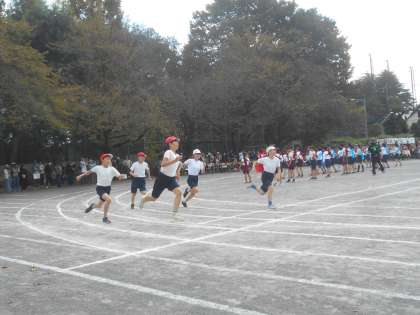 プログラム7番、前半の部の最後を飾るのは、 5年生の短距離走 「目指せ!ワールドレコード 80m」 です。 すでに、前のプログラムで、見事なバトンリレーを見せてくれた5年生です。 ここでは、一人一人の個の走りを全力で披露してくれました。 ここでの見どころは何といっても曲走路でスピードを落とさない走りでしょう。 体を内側に傾け、腕の振り方も走りに合わせて、 そして、最後まで全力を尽くしての走りに大きな声援が送られました。 グランドの内側では、応援団による懸命な応援もおくられました。